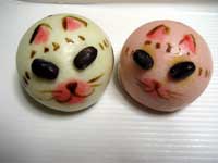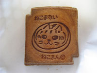 元祖ねこまんは、粘土の作品で、目は本物の小豆を使っています。 作品展で、お饅頭の箱に入れて展示していたら 「これ、ちょっと堅なってますけど、レンジでチンしたら柔らかなりますか?」 と聞かれたり、本物のお饅頭と間違われることが多かったです。 「せっかくだから、本物のお饅頭にして欲しい!」 という要望も多くて、和菓子屋さんに色々相談したのですが、日保ちや価格の問題がむつかしくて、なかなか実現しませんでした。 じょうよ饅頭が一番イメージに合うのですが、日保ちが二日と短くて。 特にお年寄りは大事にしまいこんでしまわれることがあるので……。 私の忘れられない経験ですが、子供のころ、祖母から抹茶をまぶしたようなバームクーヘンをもらって、珍しいなとよく見たら、一面の青カビでした☆……というびっくりエピソードが(^^;) 一口かじってしまった妹は、今でもあの味が忘れられないと言っています。 当時大変珍しいお菓子だったので、立派な箱入りのまま、お仏壇にかなり長期間お供えしていたようです。 ここまで極端な事はそうはないかと思いますが、やはり安心できるお煎餅にとりあえずは落ち着きました。 写真上が粘土の元祖ねこまんと、お煎餅です。 写真下は、試作していただいたお饅頭のねこまんです。 いつかは饅頭タイプのねこまんを実現してみたいです♪ |
