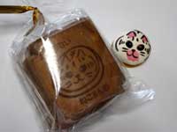 元祖ねこまんは、粘土の作品で、目は本物の小豆を使っています。 作品展で、お饅頭の箱に入れて展示していたら 「これ、ちょっと堅なってますけど、レンジでチンしたら柔らかなりますか?」 と聞かれたり、本物のお饅頭と間違われることが多かったです。 「せっかくだから、本物のお饅頭にして欲しい!」 という要望も多くて、和菓子屋さんに色々相談したのですが、日保ちや価格の問題がむつかしくて、なかなか実現しませんでした。 じょうよ饅頭が一番イメージに合うのですが、日保ちが二日と短くて。 特にお年寄りは大事にしまいこんでしまわれることがあるので……。 私の忘れられない経験ですが、子供のころ、祖母から抹茶をまぶしたようなバームクーヘンをもらって、珍しいなとよく見たら、一面の青カビでした☆……というびっくりエピソードが(^^;) 一口かじってしまった妹は、今でもあの味が忘れられないと言っています。 当時大変珍しいお菓子だったので、立派な箱入りのまま、お仏壇にかなり長期間お供えしていたようです。 ここまで極端な事はそうはないかと思いますが、やはり安心できるお煎餅にとりあえずは落ち着きました。 写真上が粘土の元祖ねこまんと、お煎餅です。 写真下は、試作していただいたお饅頭のねこまんです。 いつかは饅頭タイプのねこまんを実現してみたいです♪ |